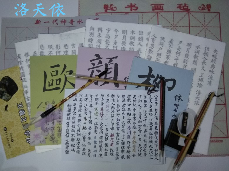 选择2、价值195元的古风定制洛天依毛笔书法字帖笔墨纸砚套装一份(字帖内容可接受定制)!内含价值15元/只的小楷洛天依、乐正绫(可换其他人)应援词定制毛笔各2只(共4只,2只黑檀木兼毫,2只红檀木狼毫),价值4元/套的A4毛笔字帖10套(每套2张),价值15元/套的A4*3毛笔字帖5套,字帖包含柳颜欧王等书法。其他宣纸砚台墨块价值20元(字帖效果可见图3、4)。